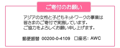 • ぜひ、ご自宅で眠っている書き損じはがきや未使用の切手等がありましたら、AWC事務局までお送り下さい。 どうぞ、宜しくお願い申し上げます。